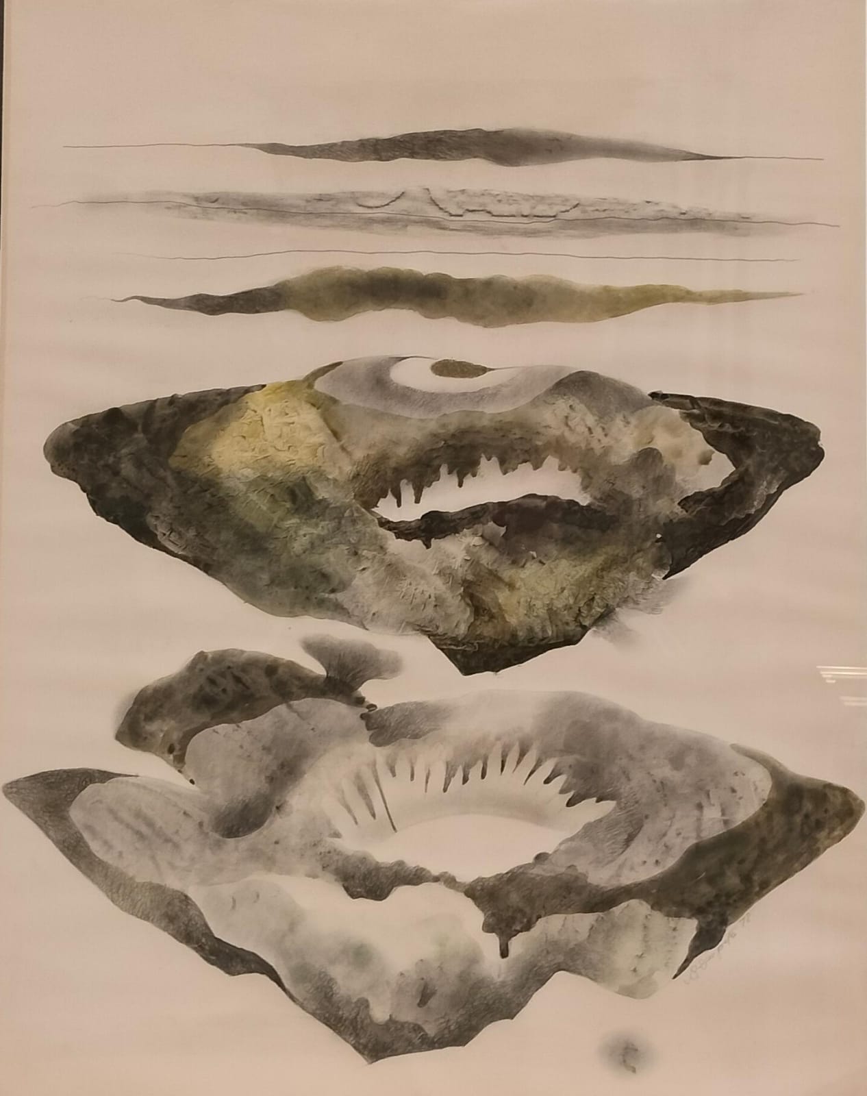 Composition is a central shape that calls to mind a crater or a series of peaks. This dominant form anchors the painting, while the surrounding spaces filled with subtly varying tones produce texture and spatial allusion. The delicate gradation between colors creates a soft, organic flow, emphasizing the interconnectedness of natural forms and the fluid boundaries between earth, rock, and sky.