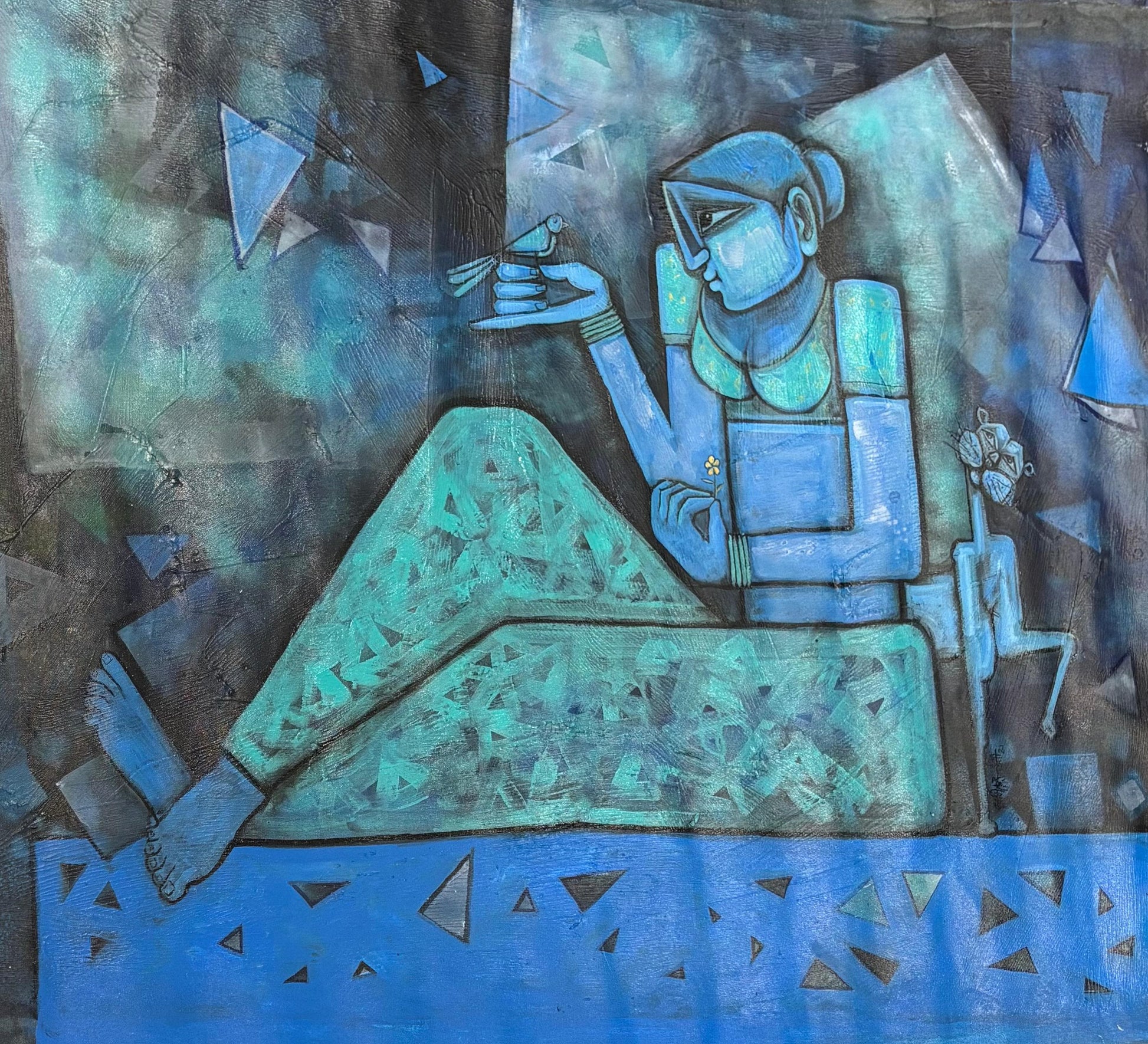 In a tender gesture, the woman holds a small bird in her hand, a delicate focal point that contrasts with the otherwise strong, faceted planes of her figure. This element introduces a subtle narrative warmth amidst the abstracted, energetic treatment of her form. The background further amplifies the dynamic feel of the painting, composed of deep blues, blacks, and grays layered beneath a scattering of irregular triangles. These shapes contribute to a sense of movement and textured complexity, complementing the angularity of the figure and enhancing the composition’s rhythmic tension.