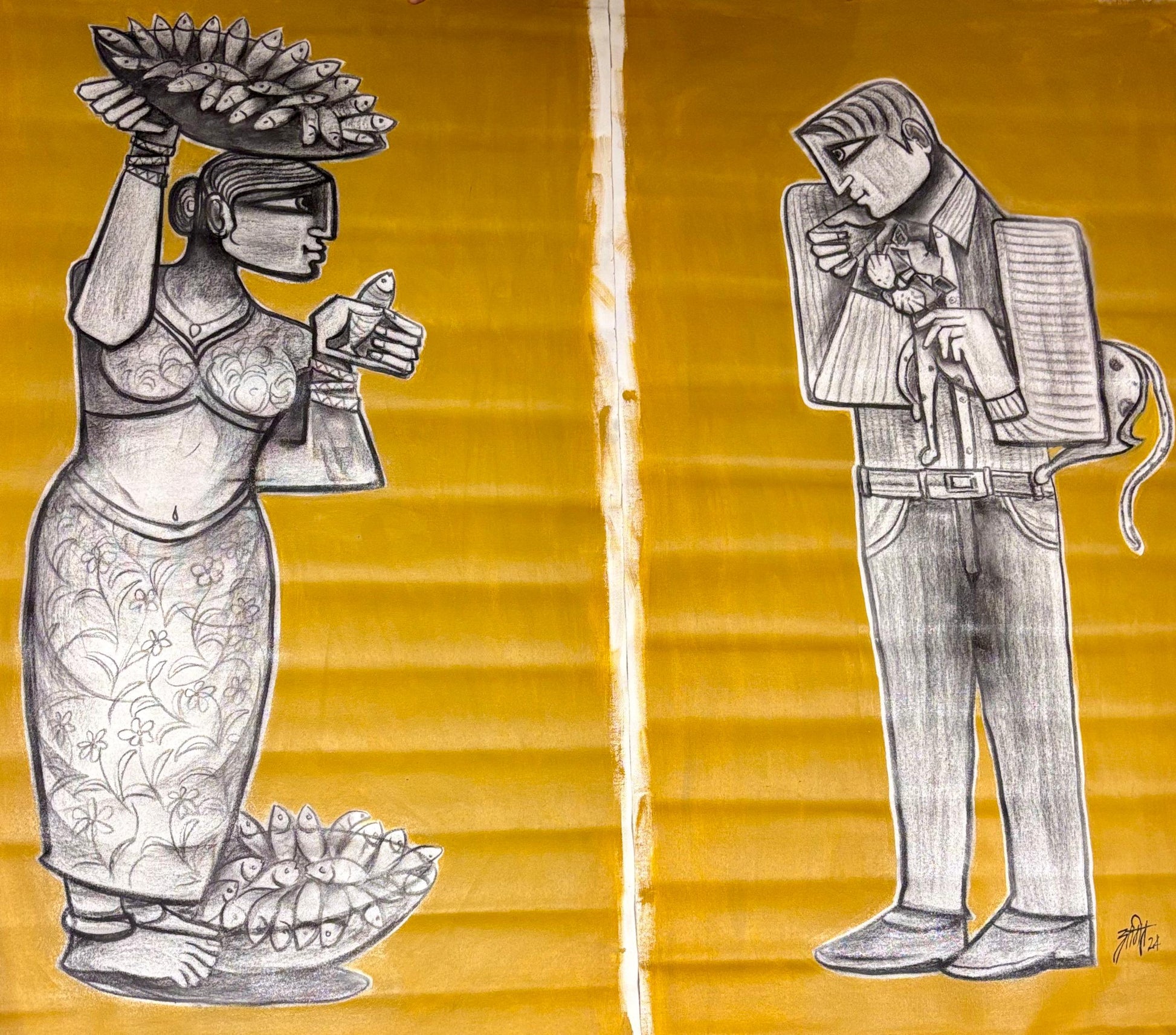 The mustard yellow-gold background, textured yet flat, creates a vibrant contrast that allows the grayscale figures to command focus without distraction. This deliberate chromatic choice enhances the work’s sense of symmetry and visual rhythm, underscoring the formal balance between the two panels. The fine line work and nuanced shading demonstrate the artist’s mastery in blending folk motifs with contemporary graphic sensibilities. This diptych eloquently captures a moment of cultural resonance, where tradition, daily life, and quiet introspection converge. The interplay between the two figures, their gestures, and the richly detailed patterns invites viewers to explore themes of labor, care, and connection within a visually striking and thoughtfully composed artwork.