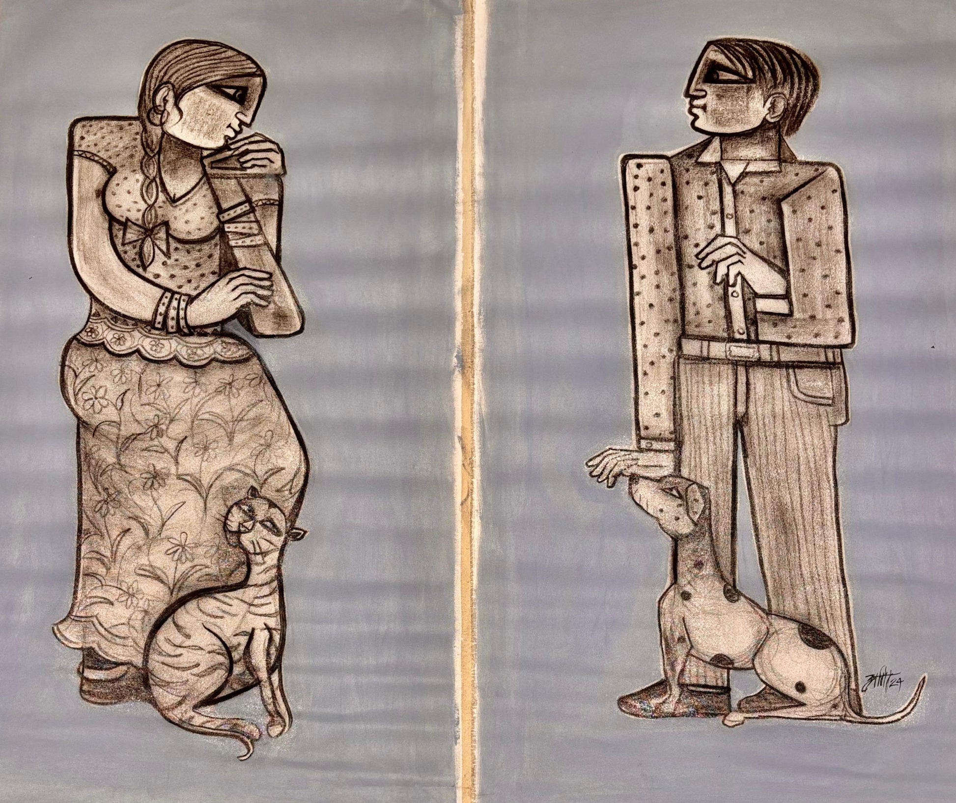 The restrained color palette of light browns, darker browns, and the soft gray-blue background lends the composition a harmonious and contemplative atmosphere. This subdued scheme enhances the emotional nuance of the scene, allowing the viewer to focus on the figures’ interaction and the symbolic resonance of their animal companions. Rajvanshi’s use of folk and primitive art conventions—such as simplified shapes, strong outlines, and decorative patterns, imbues the painting with both cultural specificity and universal accessibility. Through this work, Amit Rajvanshi invites viewers into a quiet, introspective moment where human emotion and symbolic representation intersect. The balance between abstraction and narrative, coupled with meticulous patterning and thoughtful composition, positions this piece as a sophisticated exploration of relational dynamics and visual storytelling within contemporary Indian art