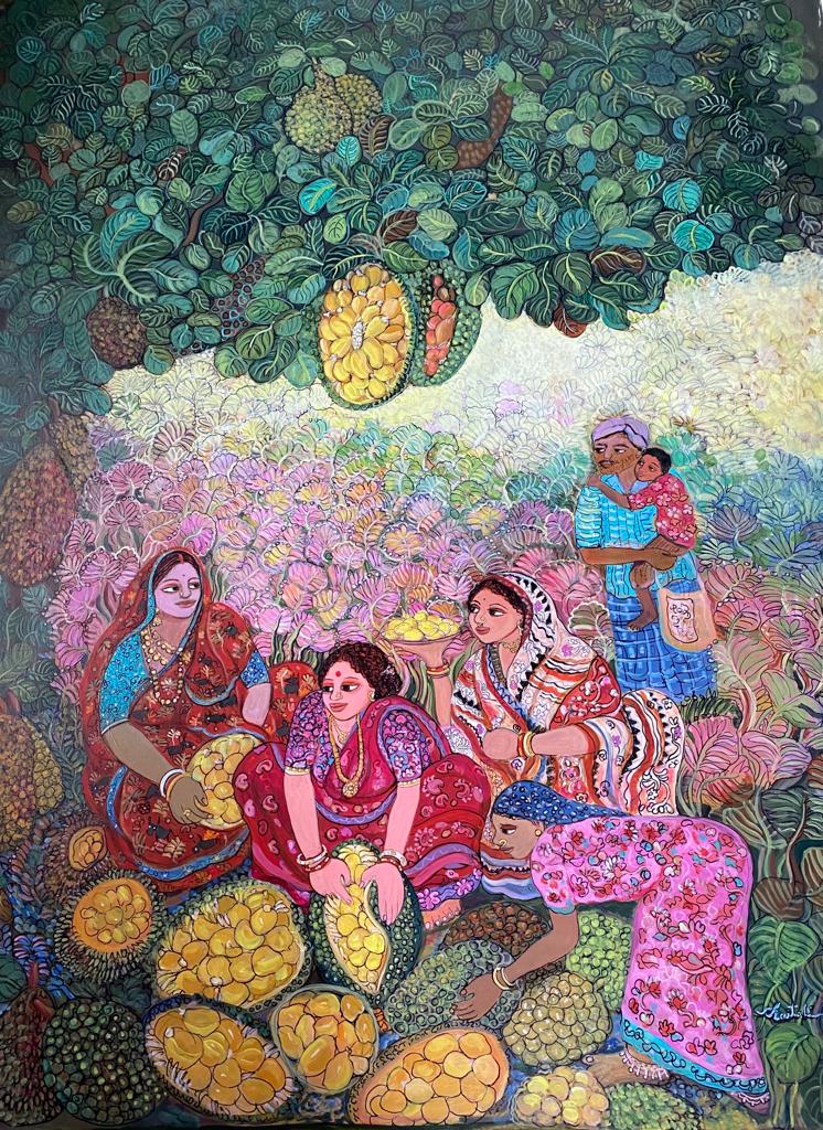 This vibrant and richly detailed painting by Chaitali Chanda captures a lively scene of women engaged in the traditional harvest of jackfruit beneath the sprawling canopy of a majestic jackfruit tree. The composition is a celebration of communal labor, cultural heritage, and the beauty of everyday life, rendered in a folk art style that emphasizes texture, color, and intricate detailing.