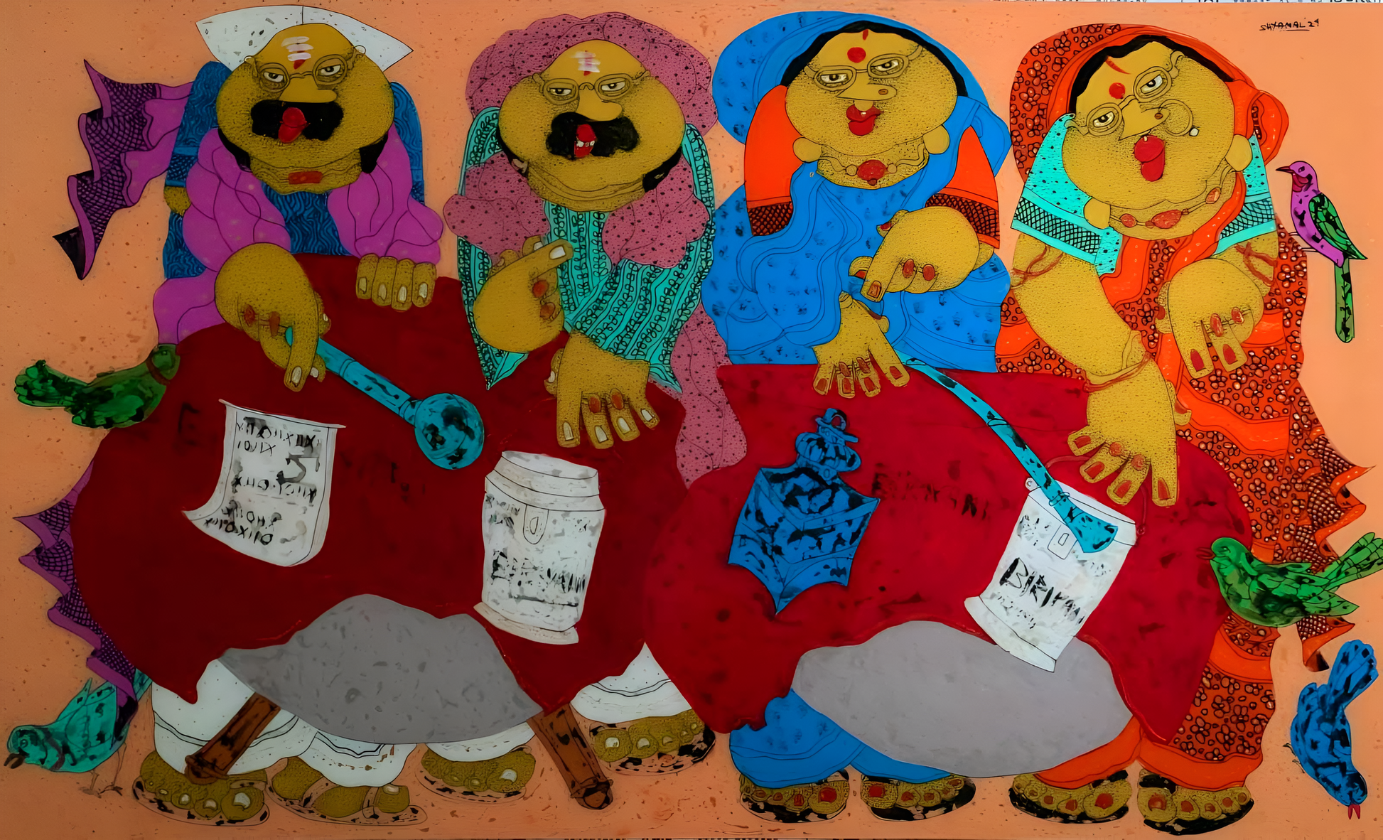 This vibrant, stylized painting by Shyamal Mukherjee presents a captivating scene featuring four figures, rendered with his signature boldness and expressive flair. The figures, likely representing members of a distinct cultural community, are characterized by exaggerated, rounded forms and enlarged hands, lending the composition a playful yet purposeful cartoonish quality. This approach highlights both individuality and shared human experience in a visually engaging way.
