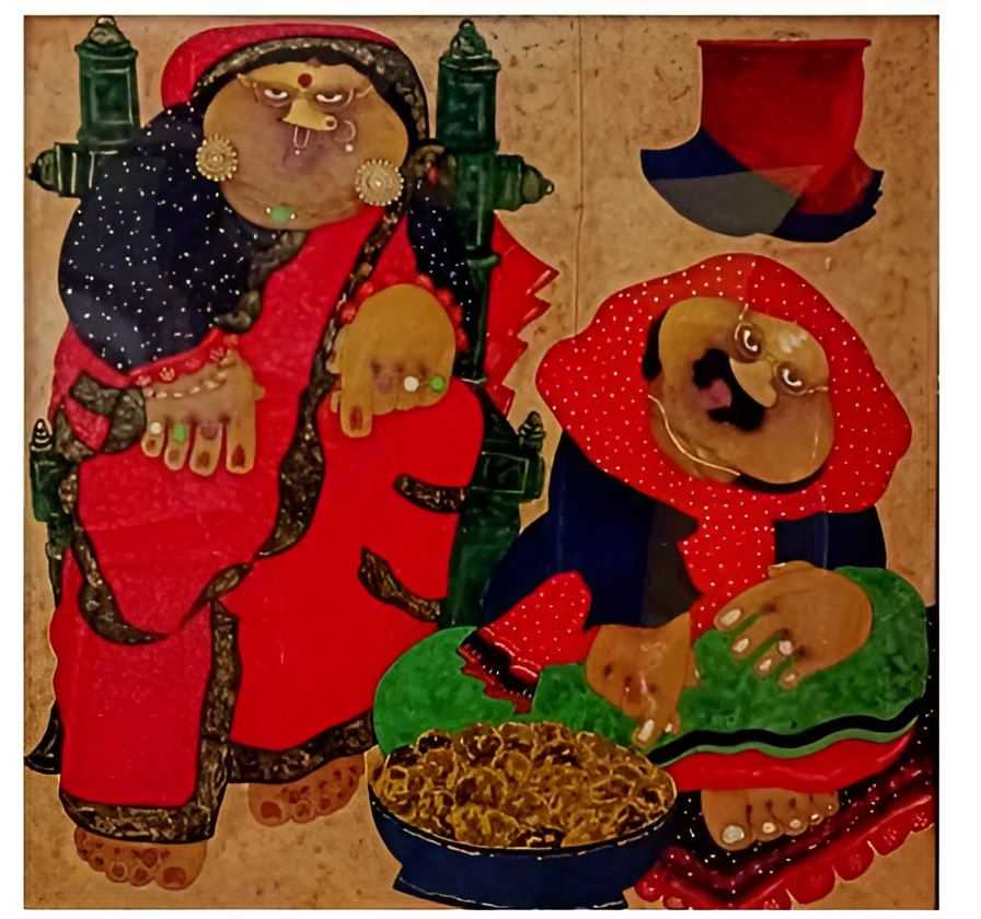 The effect is one of narrative intimacy and playful exaggeration. Mukherjee’s painting embraces the aesthetics of caricature and folk art, not to mock but to celebrate: the forms, garments, gestures, and objects all point to shared cultural memory and storytelling. His distinctive technique on acrylic sheet offers a luminous surface that amplifies the artwork’s visual energy, creating a work that is both spirited and deeply rooted in tradition.