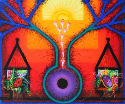 Immersed in a radiant interplay of symbolism and color, Evening at Benaras by Manu Parekh offers a profound visual meditation on spirituality and transcendence. This acrylic on canvas composition centers around a commanding all-seeing eye, a timeless emblem of cosmic insight and omnipresent awareness. The eye functions as the spiritual nucleus of the painting, anchoring the layered imagery that unfolds around it and inviting the viewer into a contemplative engagement with themes of inner vision and universal consciousness.