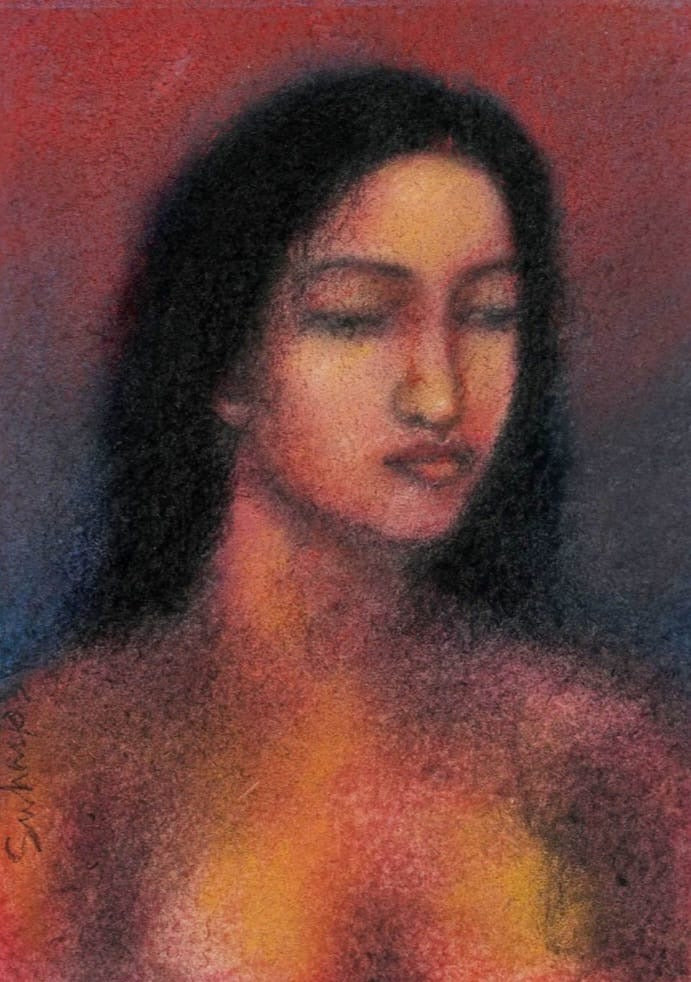 Faintly inscribed near the lower left edge is the artist’s signature, subtle and unobtrusive, marking authorship while respecting the compositional harmony. The intimacy of scale, the softness of line, and the restrained palette all speak to Roy’s distinctive sensibility, one deeply rooted in lyricism and emotional suggestion. In this Untitled work, Suhas Roy distills the essence of his mature aesthetic: the synthesis of delicacy, inner life, and visual poetry. The result is not merely a portrait, but a meditative image of feminine transcendence, one that invites the viewer to pause, reflect, and listen to the silence it so eloquently renders.
