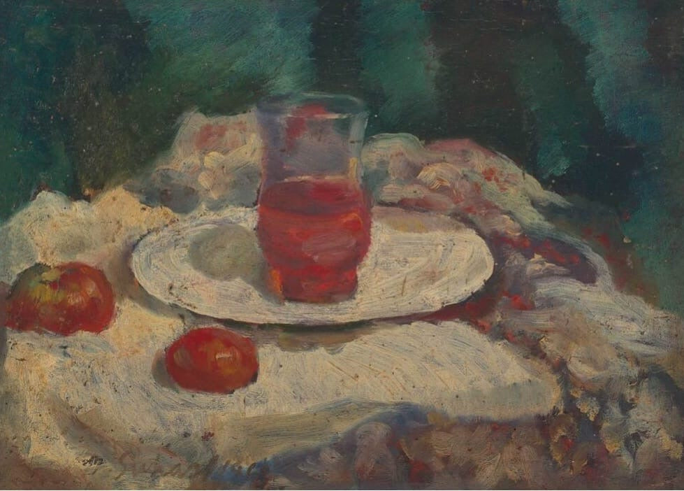The composition centers on a translucent glass tumbler filled with a luminous reddish-pink liquid, placed with precision upon a stark white plate. This focal ensemble, though modest in subject, is rendered with exquisite care and spatial awareness. Beside it, two red apples rest on a light beige tablecloth or napkin, their rounded forms delicately overlapping the plate. The apples, with their rich surface color and soft sheen, introduce organic volume and warmth into the otherwise cool, restrained setting. The background is composed of deep tonal gradations, dark teal, forest green, and shadowed brown, applied in a manner that intentionally blurs the spatial boundary, evoking a hushed, shadowy ambiance. These darker hues contrast gently with the highlighted foreground, creating a subtle but compelling chiaroscuro effect. Rather than opt for sharp detail, Roy uses a softened, almost atmospheric approach to evoke depth and suggestion, emphasizing the poetic potential of stillness and form.