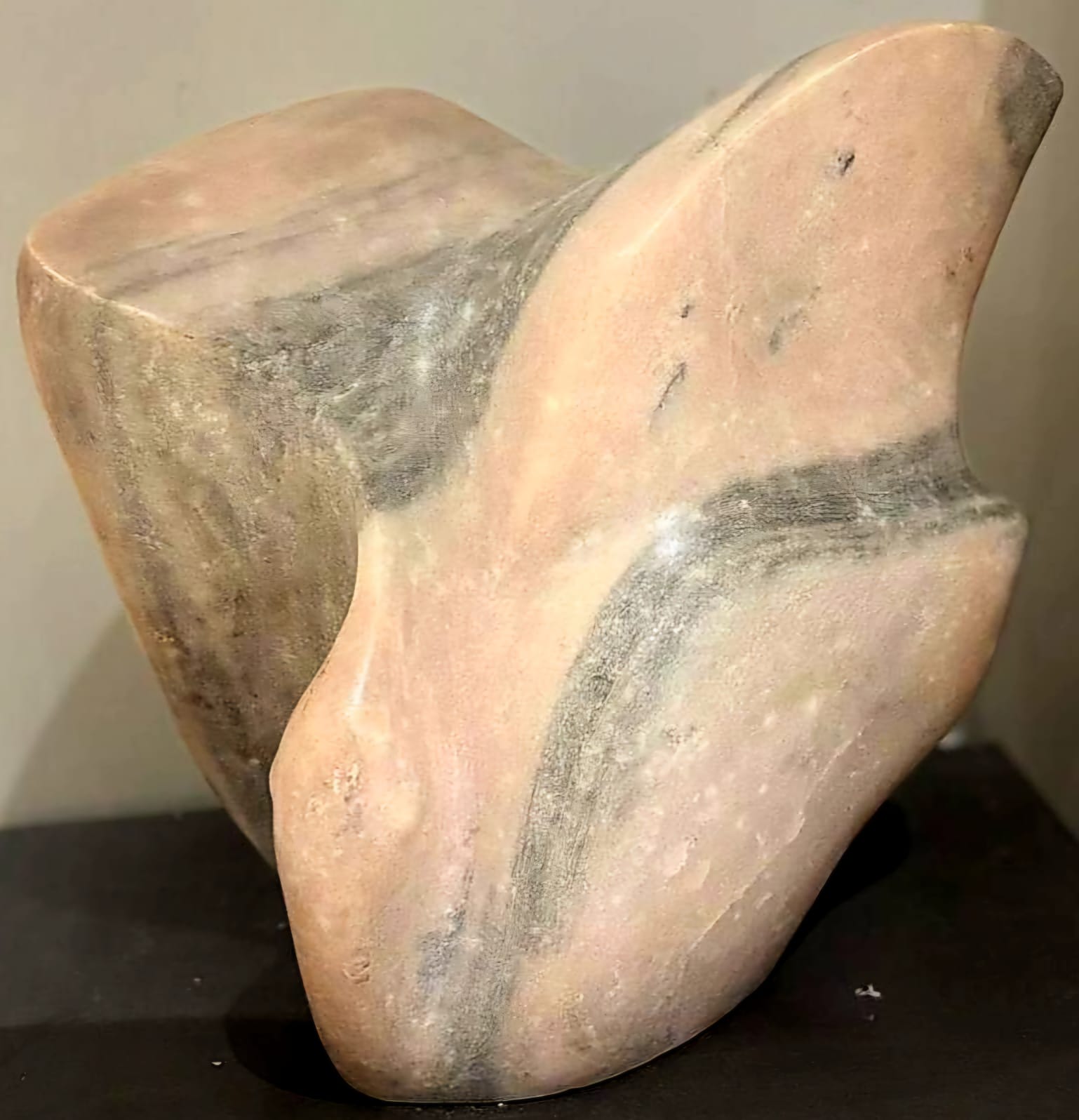 Carved from a pinkish-tan stone richly veined with dark gray and black striations, the material itself is central to the sculpture’s visual and emotional impact. These mottled patterns seem to pulse beneath the surface, imbuing the form with a quiet dynamism and suggesting the geological processes that shaped the stone over millennia. The interplay between the polished smoothness of the surface and the subtle shifts in finish reflects a dialogue between nature and human craftsmanship, between what is found and what is made. The artist’s hand is present yet restrained, allowing the material’s inherent qualities to assert themselves within the formal composition.