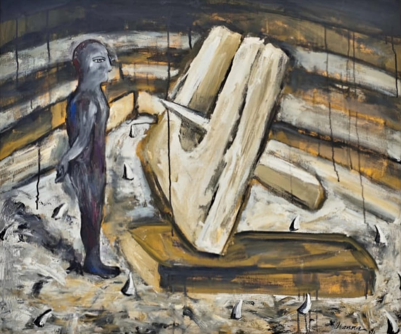 This work may be interpreted within the broader context of modern and contemporary figuration, where the body is not always clearly delineated but instead emerges, dissolves, or merges with its environment. The indistinct boundaries between the figure and its surroundings recall the work of artists such as Francis Bacon or Anselm Kiefer, who similarly explored the fragility of human existence within haunted, material worlds. Here, the abstraction becomes a vehicle for psychological inquiry, suggesting isolation, introspection, or the residue of trauma, yet it leaves space for viewers to arrive at their own emotional readings. This painting succeeds as a potent meditation on presence, space, and memory. Its abstract vocabulary transcends literal narrative, engaging the viewer in a contemplative and sensorial dialogue that bridges the physical and metaphysical realms.